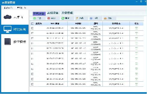 支持集中平台管理,支持局域网、互联网多种部署模式,通过在教育局或学校部署管理平台,可以直观的查看计算机机房使用情况,以及服务器和终端设备的工作状态,为教学管理、设备管理、大数据收集提供服务。