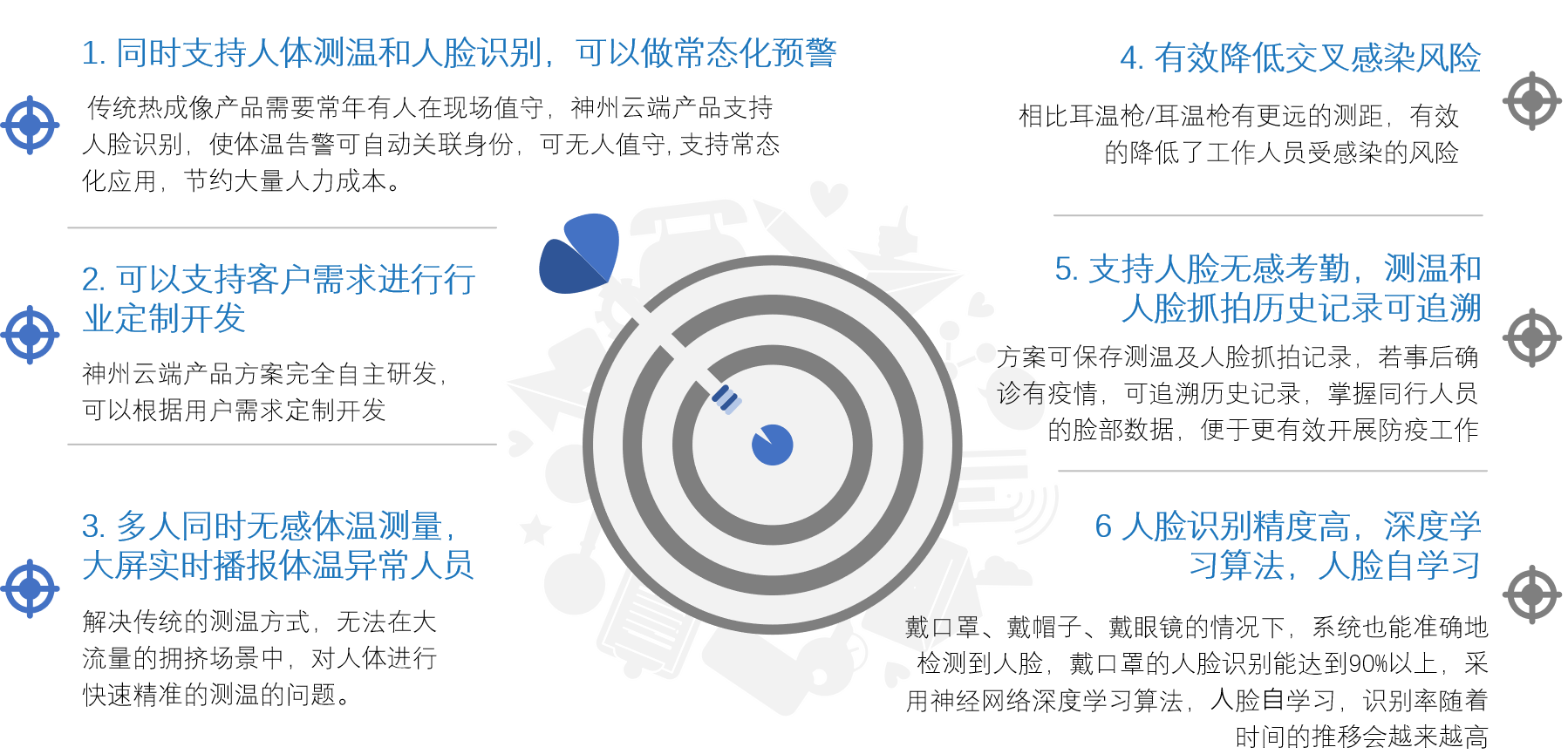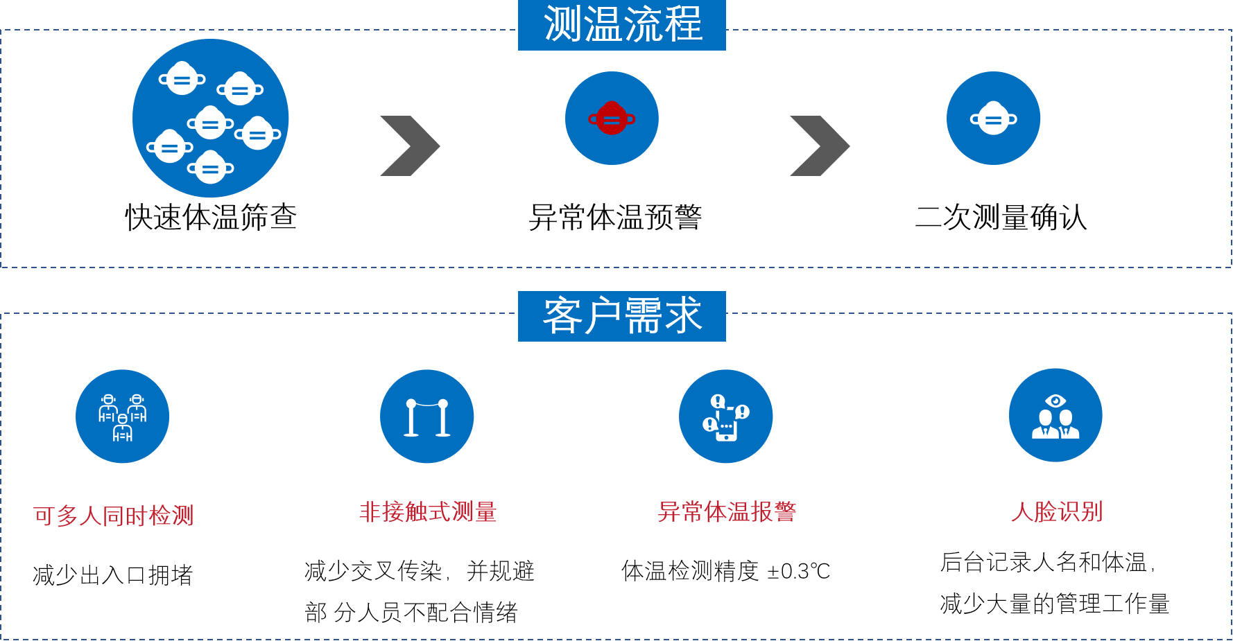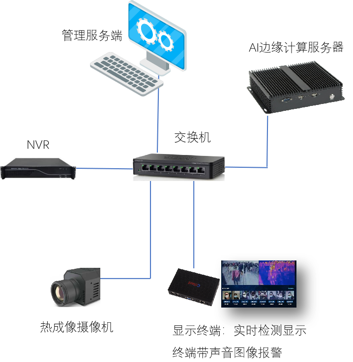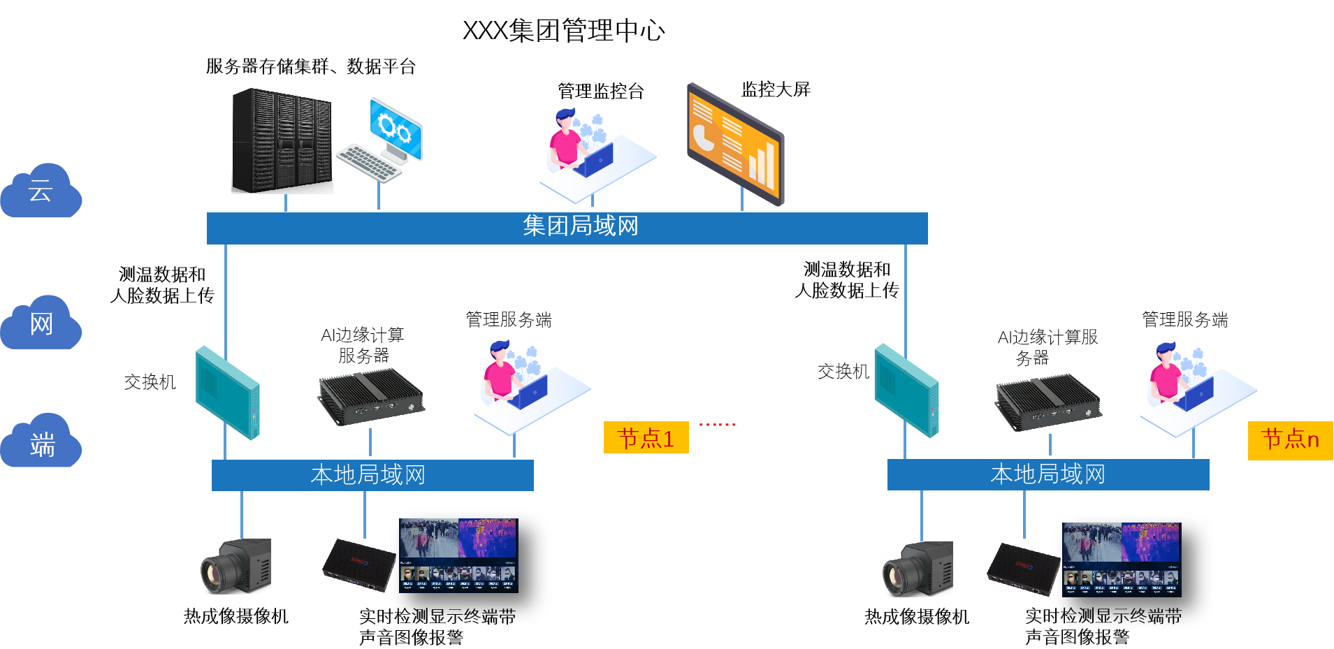 AI无感考勤测温系统采用红外热像无感快速人体测温技术,专门针对公共场所密集人群设计的非接触式、大面积、精确、高效测温及筛查设备,基于热成像精确测温技术,可及时发现体温异常人员并报警,协助监管部门执行快速干预手段和应急措施,防止病毒疫情在公共场所下出现大范围感染人员扩散的危险。可广泛应用于机场、火车站、客运站、地铁站等综合交通枢纽以及学校、综合园区等人群聚集区。设备包括前端人体测温热像仪和管控终端,管控终端安装有测温管理软件,用于对测温设备进行管理和测温报警。支持集团分支部署中心管控的模式,支持人脸识别无感考勤,无需人员值守,可以让测温成为常态化应用。