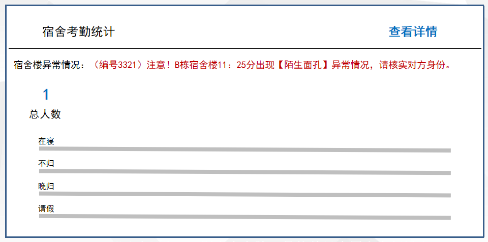 3,宿舍无感考勤,统计每个时间段的学生进出入情况;对进出人员或晚归、夜不归宿的学生及校舍管理人员无须人工查寝,只需通过电脑把记录进行分析,自动生成需要的名单。