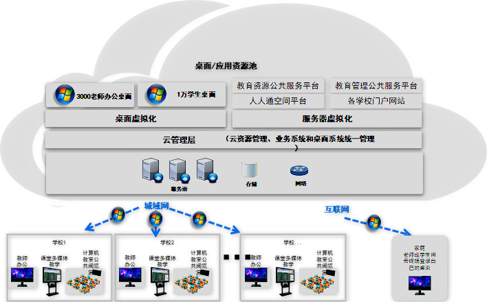 教育局管辖范围内的所有学校的教师办公和备授课桌面、学生桌面、以及三通两平台业务系统都部署在教育局中心机房的服务器资源池里,老师和学生在办公室、在教室、在家里都可以通过云终端、平板电脑、液晶一体机、手机等设备连接到教育局服务器使用自己的桌面进行备课、授课及学习,实现登录个人个性化WINDOWS桌面如登陆QQ一样简单。